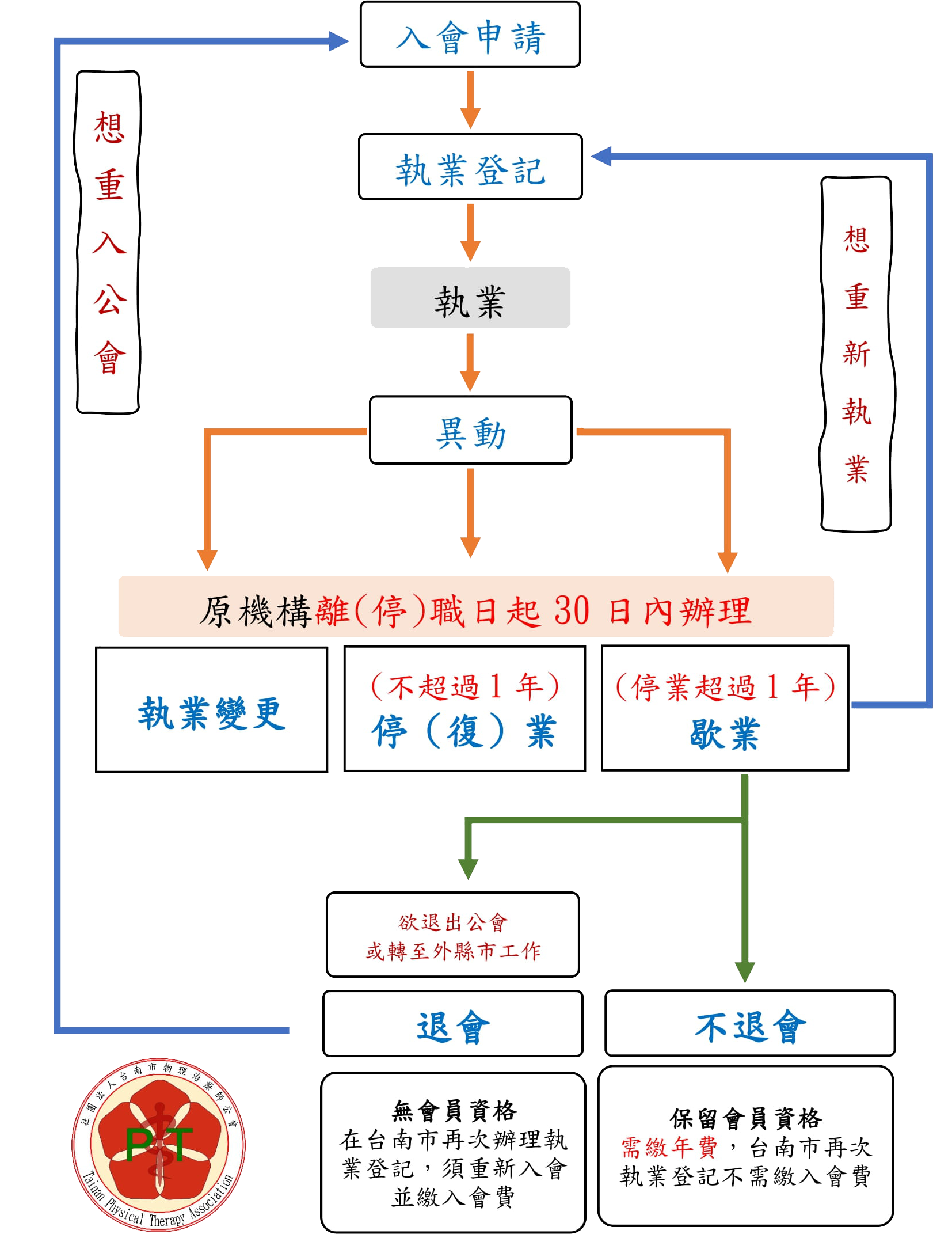 可不退會,保留會員權利與資格,由於未退會,須繳交常年會費。但重新於台南市執業登記時,可不必再繳交入會費。 - 退會:
